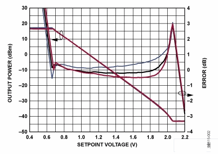 圖2:ADL5330輸出功率與AD8318設定點電壓關系曲線,PIN = -1.5 dBm