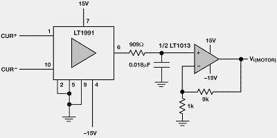 LT1995和LT1991精密增益放大器用不同方式測量電機的電壓和電流(分別為圖1和圖3所示)。