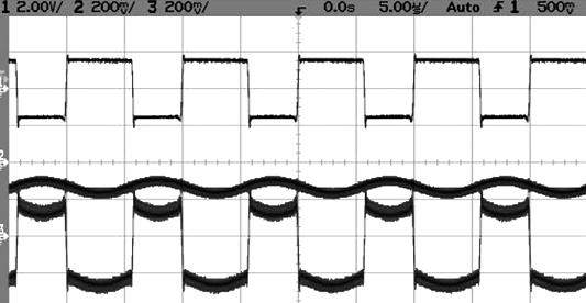 圖6a: PWM驅動占空比為60%的功率測量電路波形、0.1感應電阻和小電機電阻。軌跡1為電壓,軌跡2為電流,軌跡3為瞬時功率。