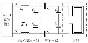 EMC濾波電路濾去了載波頻率為13. 56 MHz阻抗變換時的諧波干擾。它有一個固定的諧振頻率,這個頻率是實際數據傳輸率和最高副載波頻率的結合。如用曼切斯特編碼時,傳輸的最高數據率為424 kbit/ s,頻率為848 kHz,則諧振頻率為14. 408MHz。