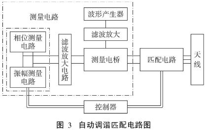 本文提出了一種自動匹配技術,其電路如圖3所示,主要包含測量電路,匹配電路和控制電路。因為手工匹配方法耗時長,且需要良好的意識和豐富的經驗來選擇合適的電容,另外必須配備一些昂貴的設備,如網絡分析儀或阻抗分析儀等。對于一些小公司來說,是不現實的。同時,一些手持式RF設備的發展使得手動匹配越來越不適應。對于這些移動設備,最理想的天線電路應該僅僅包含集成模塊,且隨著阻抗變化可以自動匹配。