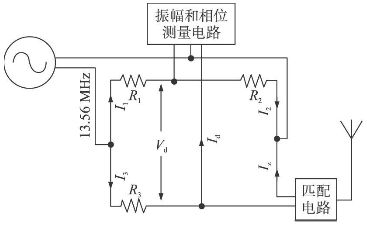 (1)測量電橋 用來測試天線的反射系數。主體部分為惠斯通電路,如圖4所示。其電路中的直流電源用波形產生器替代,用來生成13. 56 MHz的正弦載波信號。其中電阻R1、R2、R3 都為50 Ω。