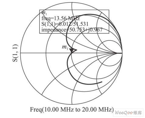 手動調諧即是交替不斷調整電容C1、C2 的值,同時觀察曲線變化,直到在所要求的頻率點S11等于0。圖2為某一天線電路在頻率在10~20MHz之間變化時,其反射系數的變化曲線,其中,標記13. 56MHz的點, S11值近似為0,達到了匹配要求。
