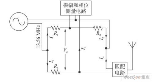 (1)測量電橋 用來測試天線的反射系數。主體部分為惠斯通電路,如圖4所示。其電路中的直流電源用波形產生器替代,用來生成13. 56 MHz的正弦載波信號。其中電阻R1、R2、R3 都為50 Ω。