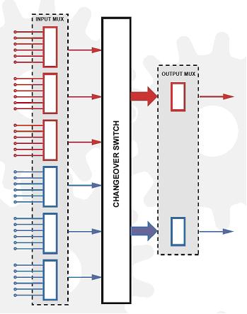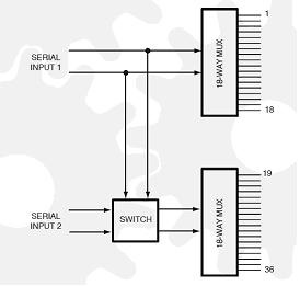 40-789射頻開關模塊可以配置成兩個18路的多路復用器(兩個獨立的輸出)或一個單獨的36路多路復用器。
