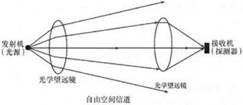 一個(gè)光無線通信系統(tǒng)構(gòu)成如圖1所示,包括三個(gè)部分:發(fā)射機(jī)、信道和接收機(jī)。光發(fā)射機(jī)的光源受到電信號(hào)的調(diào)制,并通過作為天線的光學(xué)望遠(yuǎn)鏡,將光信號(hào)經(jīng)過空間送到接收端的望遠(yuǎn)鏡。高靈敏度的光接收機(jī),將望遠(yuǎn)鏡收到的光信號(hào)再轉(zhuǎn)換成電信號(hào),值得注意的是,發(fā)送端和接收端之間,必須是互相視線可見的,兩終端之間不能有阻擋。由于大氣空間對(duì)不同光波長信號(hào)的透過率有較大的差別,可以選用透過率較好的波段窗口。光無線系統(tǒng)通常使用0.85μm或1.5μm紅外波段。0.85μm的設(shè)備相對(duì)便宜,一般應(yīng)用在傳輸距離不太遠(yuǎn)的場合。1.5μm的設(shè)備價(jià)格要高一些,但在功率、傳輸距離和視覺安全方面有更好的表現(xiàn)。 1.5μm的紅外光波大部分都被角膜吸收,照射不到視網(wǎng)膜,因此,相關(guān)安全規(guī)定允許1.5μm波長設(shè)備的功率可以比0.85μm的設(shè)備高2個(gè)等級(jí),1.5μm波長的光無線通信具有更廣闊的使用前景。
