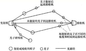 對(duì)天氣非常敏感是FSO的另一個(gè)主要問題。晴天對(duì)FSO傳輸質(zhì)量的影響最小,而雨、雪和霧的影響較大。據(jù)測試,F(xiàn)SO 受天氣影響的衰減經(jīng)驗(yàn)值分別為:晴天,5~15dB/km;雨天,20~50dB/km;雪天,50-150dB/km;霧天,50~300dB/km。可見影響最大的是霧天,這是因?yàn)殪F中的散射粒子的半徑與激光的波長在同一數(shù)量級(jí)上,而且散射粒子非常集中,從而使光線的傳播方向發(fā)生偏轉(zhuǎn),造成空間、角度和時(shí)間上的擴(kuò)展,如圖2。對(duì)于這種大氣現(xiàn)象處理的方式,與微波通信中對(duì)待雨衰相似。要在系統(tǒng)傳輸?shù)挠?jì)算中,為光信號(hào)的衰減留有足夠的系統(tǒng)功率余量,以便在出現(xiàn)濃霧最大衰減的情況下,仍能接收到所需的光信號(hào)功率。重要的是,要獲得所在地長期的氣象統(tǒng)計(jì)資料,能夠知道不同等級(jí)(能見度)的霧,即不同衰減的大氣介質(zhì)出現(xiàn)的統(tǒng)計(jì)規(guī)律。如果了解到衰減值大于某一指標(biāo)出現(xiàn)的概率,就能確定光無線系統(tǒng)為了保證可用性的指標(biāo)(比如99.9%),需要容納多大的大氣損耗。而傳輸距離的計(jì)算公式如式(1)所示。
