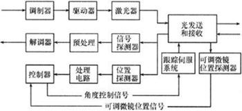 隨著通信技術(shù)的發(fā)展,對(duì)FSO系統(tǒng)的傳輸速率和距離均提出了更高的要求,如果要提高這兩個(gè)技術(shù)指標(biāo),就必須要增大激光器的發(fā)射功率和提高接收機(jī)的靈敏度,但擴(kuò)束法和多束法對(duì)性能指標(biāo)的改善有限,于是動(dòng)態(tài)跟蹤法就應(yīng)運(yùn)而生,即利用伺服系統(tǒng)通過反饋裝置獲得光束偏差信息,調(diào)整可調(diào)微鏡,使光束時(shí)刻對(duì)準(zhǔn)接收器。采用動(dòng)態(tài)跟蹤技術(shù)的FSO系統(tǒng)設(shè)備功能結(jié)構(gòu)如圖3所示,一般采用雙反饋方式,外反饋是位置探測器輸出的入射激光束的位置誤差信號(hào),內(nèi)反饋是伺服系統(tǒng)控制的可調(diào)微鏡的位置信號(hào),入射激光束通過接收光學(xué)系統(tǒng)后,聚集到位置探測器上,位置探測器將激光束的位置誤差信號(hào)輸出到主處理器。同時(shí)可調(diào)微鏡位置探測器將探測到的微鏡位置信號(hào)送到控制處理器中,控制處理器利用優(yōu)化的跟蹤算法進(jìn)行計(jì)算,輸出的角度控制信號(hào)控制伺服系統(tǒng)調(diào)整可調(diào)微鏡,使接收光學(xué)系統(tǒng)始終對(duì)準(zhǔn)入射激光束。