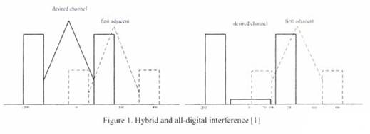 HD無線技術(shù)不需要新的頻譜,因為它可利用現(xiàn)有的AM和FM頻段。在HD無線廣播業(yè)內(nèi),存在混合與全數(shù)字兩種形式。混合模式是在兩個鄰近邊頻帶上傳輸數(shù)字信號,在兩個頻帶之間播送模擬信號。全數(shù)字模式消除了模擬信道,采用全數(shù)字傳輸。與FM和AM信號獲取相比,在接收這種信號時涉及到大量的數(shù)字信號處理。對于數(shù)字邊頻帶,去除鄰近的模擬信道是必需的(圖1),更復雜的調(diào)制方案涉及到正交頻分復用(OFDM)。