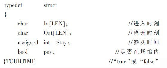 當游客在圖1 中入口處的0 號讀寫器刷卡后, 即可授權進入博物館參觀, 游客門票中的標簽ID 號信息被送往PC 上位機實時處理, 建立游客文檔INFO.游客文檔包括進入各場館的時間、離開各場館的時間、在各場館參觀的時間、當前所在的場館區域及游客頭像等信息,INFO 的結構體表達式如下: