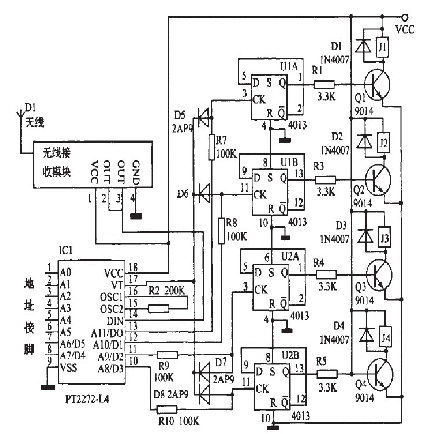 所以輸出接口在未解碼時就為低電平輸出了,即為非鏤狀態(tài)。所以如果將蠶2(a)中酶PT2272--M4改為Pr2272~L4,相應的將原理網(wǎng)圖2(a)改為圖3,也能實現(xiàn)同樣的功能,即四路非鎖狀態(tài)。如果將某一路改為蠢錟狀態(tài),將耀應的二極管去掉幫霹。鍘如,去掉D5,就將PT2272--L4的第13腳的非自鎖定輸出改為錟定輸出。