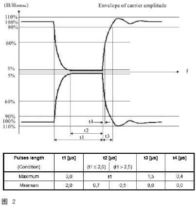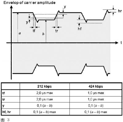 由于NFC106kbps為100%ASK調變,所以對整個High/Low信號的封包結構都有相當詳細的定義。其中幾個參數包括從100%下降到5%Am時間(t1)、5%Am持續時間(t2)、Am由5%上升至60%時間(t4)即overshoot的范圍。而212/424kbps則是8%~30%的調變率。