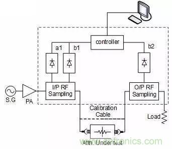 題外話:其實功率系數(shù)這個東東,不光是衰減器有,所有工作在大功率條件下的器件都有,只要工作功率的變化范圍比較大,就必須要考慮這個指標。如何測試這個指標,一般需要一套標準的測試系統(tǒng),當然也可以自己來搭建。下圖就是上篇提到的一個標準的測試功率系數(shù)的框圖,供大家參考: