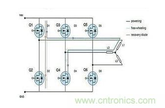 標準的三相功率級(power stage)被用來驅動一個三相無刷直流電機,如圖1所示。功率級產生一個電場,為了使電機很好地工作,這個電場必須保持與轉子磁場之間的角度接近90°。六步序列控制產生6個定子磁場向量,這些向量必須在一個指定的轉子位置下改變。霍爾效應傳感器掃描轉子的位置。為了向轉子提供6個步進電流,功率級利用6個可以按不同的特定序列切換的功率MOSFET。下面解釋一個常用的切換模式,可提供6個步進電流。