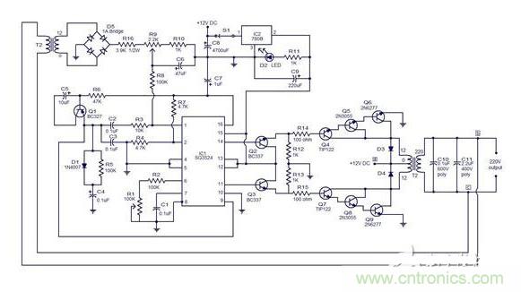 因此誘導變壓器二次電壓(由于電磁感應),這個電壓220V輸出波形的上半周期。在此期間,11腳低,其成功的階段將處于非活動狀態。當IC引腳11云高的第三季度結果Q7的獲取和交換,Q8和Q9將被打開。從+12 V電源通過變壓器的初級下半部和匯到地面通過晶體管的Q7,Q8,Q9,以及由此產生的電壓,在T2次級誘導有助于的下半部周期(標簽上標明)電流流220V輸出波形。
