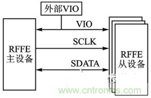 RFFE是MIPI聯(lián)盟針對射頻前端設(shè)備所提出的控制規(guī)范。單個總線上可以掛載1個主機,同時最多掛載15個從機。該總線使用2條信號線,一條是主機控制的時鐘線SCLK,另一條是雙向數(shù)據(jù)線SDATA,此外還有一條參考電壓線VIO。VIO可由主機提供,也可由外部提供。SCLK的標準頻率是32kHz-26MHz,擴展頻率是26MHz-52MHz,在空閑時SCLK和SDATA保持低電平。