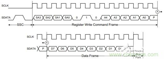 RFFE定義了很多種類的命令序列,來對總線上的設(shè)備進行讀/寫操作。每一條命令都包含:開始序列(SSC),命令序列(Command Frame)和數(shù)據(jù)序列Data Frame,如圖2為寄存器寫指令的時序。