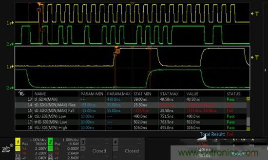 ZDS4000同時具備強大的時序分析功能,在Analyze中使能MIPI-RFFE時序分析,依靠我們具有的完整測試項目,可迅速找出時序中可能存在的問題與風險。如圖5發(fā)現(xiàn)的數(shù)據(jù)有效時間測試不通過,只需選中該項后輕輕一按B旋鈕,就可立即定位到測試不通過所在的位置。