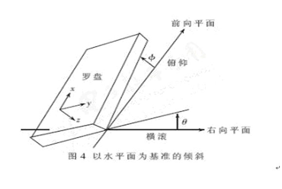 地球磁場的強度為0.6高斯左右,現(xiàn)有的磁阻傳感器可以很好地測量地磁場范圍內(nèi)的磁場強度。由于二維羅盤只能在保持水平的情況下正常工作,如果用于車輛的動態(tài)環(huán)境中,將不可能保證其永遠水平,所以在這種場合下,羅盤的可使用性大大降低。于是需要設計三維羅盤以適應各種姿態(tài)的測量。三維電子羅盤的總體設計方案如圖3所示。三軸磁阻傳感器分別從X、Y、Z 三個磁場強度方向輸出電壓,經(jīng)過放大電路分別輸入到三個具有A/D轉換能力的MCU端口,二軸加速度傳感器測量俯仰角度和橫滾角度,測量參數(shù)的意義如圖4所示。