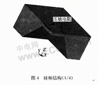 其中,壓阻式壓力傳感器主要是利用半導體的壓阻效應,把一個惠斯通電橋做在一個硅杯上,如圖4所示。當硅杯受到壓力后發生形變,惠斯通電橋的四個橋臂電阻就會發生變化,打破了電橋的電平衡,從而會有一個電信號的輸出。