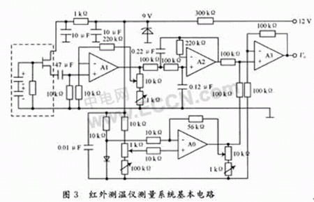 測量系統基本電路如圖3所示。傳感器輸出信號經放大、選頻濾波后,與室溫測量元件輸出進行相加和修正,最后得到與被測物體溫度成正比的輸出電壓。