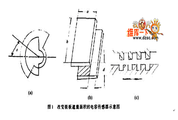 圖1是3種這類傳感器的原理圖,圖1(a)中是利用角位移來改變電容器極板遮蓋面積。假定當2塊極板完全遮蓋時的面積為S0,兩極板間的距離為d,極板間介質的介電常數為ε。當忽略邊緣效應時,該電容器的電容量為: