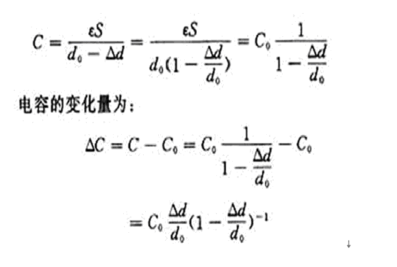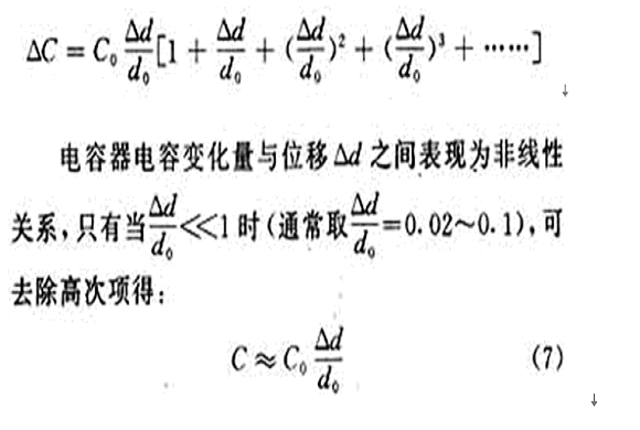 這時電容器的變化量ΔC才近似地和位移Δd成正比。其相對非線性誤差為:
