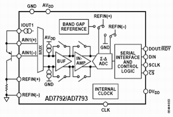 儀表放大器允許開發低噪聲、低溫漂的增益級電路。低噪聲與低溫漂非常關鍵,可以保證因溫度變化引起的電壓變化大于儀表放大器的噪聲電壓。AD7793的增益可以設置為1, 2, 4, 8, 16, 32, 64,或128。利用128倍的最大增益設置以及產生的基準電壓源,AD7793的滿度范圍是±1.17 mV/128 mV或者大約±10 mV。這樣,ADC的高分辨率特點保證無需任何外部放大器元件就可以達到最佳效果。
