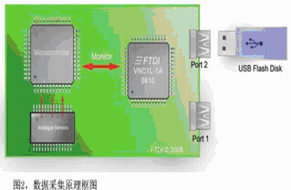 目前市場上有很多種數(shù)據(jù)采集設備可用于在PC上記錄數(shù)據(jù),如National Instrument的LabVIEW,不過這類設備的傳感器件開始越來越多地采用USB接口而不是RS232或其他傳統(tǒng)接口。過去在嵌入式系統(tǒng)中應用USB設備需要性能相對較強的硬件,要帶有USB Host控制器接口、RTOS以及USB軟件驅動,結果因USB Host功能實施成本的原因設計工程師一直都不太愿意在小型8位或16位MCU系統(tǒng)上增加USB設備。但隨著最新一代智能USB Host控制器IC的推出,與MCU配合使用不僅可為PC應用使用USB數(shù)據(jù)采集設備,而且還可將數(shù)據(jù)存儲在低成本高容量的閃存盤上。
