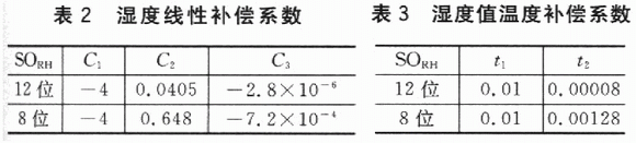 式中:RHincar為經過線性補償后的濕度值,SORH為相對濕度測量值,C1、C2、C3為線性補償系數,取值如表2所列。
