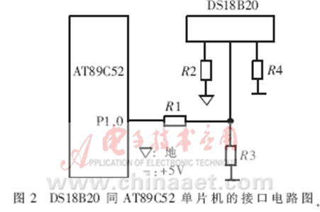 DS18B20的測溫原理為:內部計數器對一個受溫度影響的振蕩器的脈沖計數,低溫時振蕩器的脈沖可以通過門電路,而當到達某一設置高溫時,振蕩器的脈沖無法通過門電路。計數器設置為-55℃時的值,如果計數器到達0之前門電路未關閉,則溫度寄存器的值將增加,這表示當前溫度高于-55℃。同時,計數器復位在當前溫度值上,電路對振蕩器的溫度系數進行補償,計數器重新開始計數直到回零。如果門電路仍然未關閉,則重復以上過程。溫度轉換所需時間不超過750ms,得到的溫度值的位數因分辨率不同而不同[2]。DS18B20同AT89C52單片機的接口電路如圖2所示。這種接口方式只需占用單片機一根口線,與智能儀器或智能測控系統中的其它單片機或DSP的接口也可采用類似的方式。