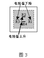 如圖2(b)所示,當向空腔部分加上一定的壓力時,膜片受到一定程度的拉伸或收縮而產生形變。壓電電阻的排列方法如圖3所示,受到拉伸的電阻R2和R4的阻值增加;受到壓縮的電阻R1和R3阻值減小。