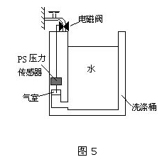 圖5是PS壓力傳感器在全自動洗衣機中的應用實例。如圖所示,利用氣室,將在不同水位情況下水壓的變化,作為空氣壓力的變化檢測出來,從而可以在設定的水位上自動停止向洗衣機注水。