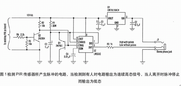 通常,當所檢測區域無人時,無脈沖被檢測,而輸出為低態。當檢測到脈沖時,輸出變高態。電源(12~14Vdc)通過立體聲電話插口(與輸出信號一道)供電,然后穩壓到+10V。此電路放置在PIR傳感器內,電話插口放在機盒的下部。電阻器R4連接PIR LED驅動器。地和+10V連接到PIR中的適當位置。
