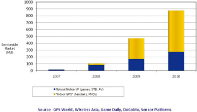 我們每天都在不知不覺中與微型機電傳感器(MEMS-micromechanical sensor)打交道:壓力、臨近與運動傳感器(proximity and movement sensor)、陀螺儀、加速計、麥克風和壓電裝置等等?,F如今,MEMS技術在以下四個領域取得了商業性的成功:用于氣囊控制的加速計;用于監測汽車耗油量的壓力傳感器;噴墨打印機頭和用于投影顯示的反射鏡。根據iSuppli的預測,微型機電傳感器的全球市場將會由2006年的61億美金增長到2012年的88億美金。到2012年為止,MEMS儀器的單位出貨量的年復合增長率預計為6.4%,其同期年銷售額的復合增長率預計為5.5%。雖然產品總需求量的增長相對緩慢,但某些單項產品的市場卻成長得非常迅速;例如,iSuppli預言手機的平均復合增長率將為22.9%,到2012年,僅此一項產品的市場將達到九億二千五百萬美金。事實上MEMS傳感器正在越來越多地被用于消費電子產品。MEMS肯定會被大量地應用于消費電子產品中,最大的MEMS制造商們都把賭注押在了這塊市場上。STMicroelectronics公司MEMS事業部門的總監Benedetto Vigna認為,MEMS技術的用戶化將為此項技術開辟新的領域,它也將會受到無線傳感器網絡主體配置的影響。MEMS傳感器也可以被整合到游戲控制器中,使它們能夠在便攜式終端上跟蹤操縱者手部的運動,并以此來調節顯示屏上的畫面變化或進行目錄瀏覽。