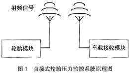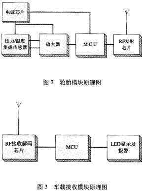 該系統(tǒng)的工作原理如下,把輪胎模塊裝置在輪胎內(nèi),壓力和溫度傳感器檢測(cè)輪胎內(nèi)部當(dāng)前的應(yīng)力和溫度信息,獲得的模擬信號(hào)經(jīng)過(guò)A/D變換器轉(zhuǎn)換成數(shù)字信號(hào),然后通過(guò)射頻發(fā)射器發(fā)送出去。車(chē)載接收模塊裝置在駕駛室內(nèi),射頻接收器接收來(lái)自輪胎模塊的應(yīng)力和溫度信息,當(dāng)輪胎壓力過(guò)高或者過(guò)低時(shí),通過(guò)顯示和報(bào)警裝置發(fā)出報(bào)警信息。