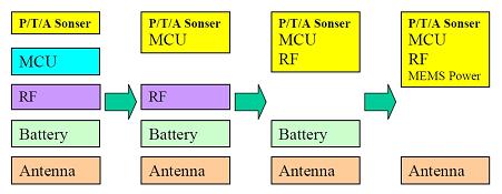 TPMS傳感器模塊技術發展趨勢是將發射模塊向高度集成化、單一化、無線無源化方向發展(圖12)。隨著TPMS產品市場對IC高整合度和高可靠性的要求,目前已經有了如InfineonSP12/SP30、GENPX那樣的將所需測試各物理量的傳感器與MCU合二為一的智能傳感器模塊,在未來幾年內還會開發出包含RF發射芯片三合一的模塊,包含利用運動的機械能自供電的四合一的模塊,屆時胎壓力監測發設器只有一個模塊和一個天線組成,客戶的二次設計變得十分簡便。