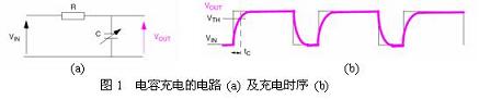 如圖1(a)所示,在RC網(wǎng)絡(luò)施加周期性充電電壓Vin,測量Vout會得到如(b)的時序,通過檢測充電開始到Vout到達(dá)某一門限值的時間tc的變化,就可以判斷出是否有人體接觸。圖2顯示出有人體接觸時充電時間會變長。