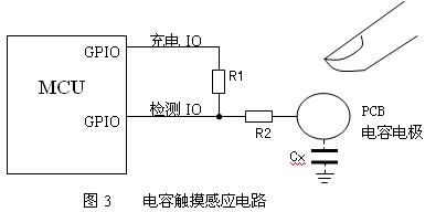 實現(xiàn)電路如圖3,使用一個I/O口對PCB構(gòu)成的電容充電,另一個I/O口測量電壓,對于多個按鍵時使用同一個I/O口充電。R1通常為幾百K到幾M,人體與PCB構(gòu)成的電極電容一般只有幾個pF,R2用于降低噪聲干擾,通常為10K。