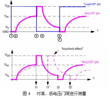 為了提高系統(tǒng)的可靠性和穩(wěn)定性,改進(jìn)的測量方法是對Vout進(jìn)行高和低兩個門限進(jìn)行測量。如圖4所示,通過對t1和t2的測量,從而達(dá)到更可靠的效果。另外,多次測量也是有效的降低高頻干擾的有效方法。