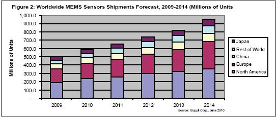 圖2所示為iSuppli公司對2009-2014年MEMS傳感器市場的預測。