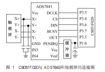 ADS7843是一種四線式觸摸屏控制器,目前較多應用于電阻式觸摸屏輸入系統中。盡管有很多相關的典型應用和應用注意事項,但是在實際使用過程中仍然會遇到一些問題。應用在通用的單片機中所出現的問題及解決方法,已有一些介紹。本文是對基于高速、流水線結構的 C8051的觸摸屏控制系統設計中所遇到的問題進行分析處理,并給出了解決方法。