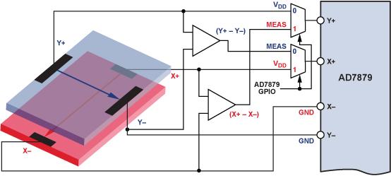 半周期 1:電壓施加于Y層,同時(shí)測(cè)量(VY+ – VY–)、VX–和 VX+。每完成一個(gè)測(cè)量,AD7879 就會(huì)產(chǎn)生一個(gè)中斷,以便處理器改變GPIO配置。