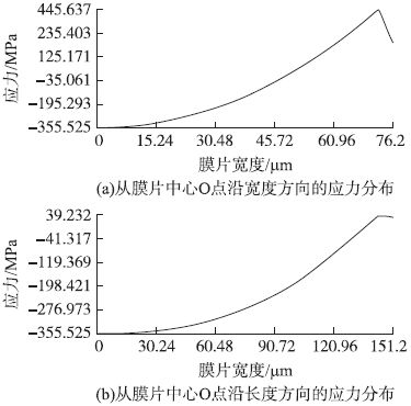 本文以量程0.1 MPa 的犧牲層結構壓力傳感器為例,設計出電壓源E =5 V 時,滿量程輸出為60 mV的壓力芯片。為了滿足靈敏度的設計要求,改變彈性膜片的寬度、長度、厚度和犧牲層厚度對應力分布進行模擬仿真( 模擬仿真時多晶硅楊氏模量EX = 1.7 ×1011 N/m2,泊松比PRXY =0.24,多晶硅納米薄膜應變因子G =30) ,經過優化后,得到滿足設計要求的彈性膜片尺寸: 長度a = 300 μm、寬度b = 150 μm、膜片厚度H1 =3 μm、犧牲層厚度H2 =3.5 μm。