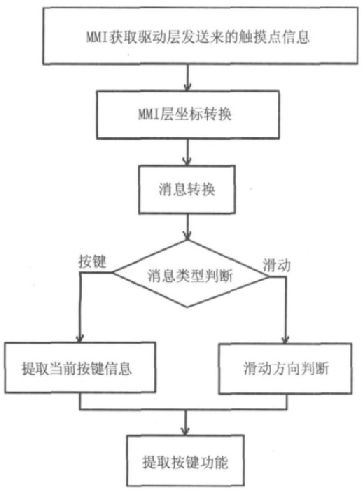 如圖6 所示,在獲得觸摸點消息后,系統MMI 層調用MMI 層坐標轉換函數提取驅動層發送的觸摸點位置信息,并轉化為MMI 層的位置信息。當有觸摸操作進行時,底層驅動程序向MMI 層發送觸摸點的位置信息。在獲得驅動層觸摸點信息后,系統MMI 層調用MMI 層坐標轉換函數提取驅動層發送的觸摸點位置信息,并轉化為MMI 層的位置信息。如果系統所發事件是按下事件(MMI_PEN_EVENT_DOWN),系統根據觸摸點坐標調用當前按鍵信息提取函數獲得被選按鍵信息;如果是滑動事件(MMI_PEN_EVENT_MOVE),則進行滑動方向判斷。
