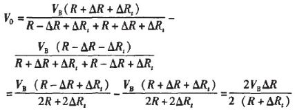 如圖2傳感器輸出電壓信號Vo=VB△R/R(R1=R2=R3=R4,△R1=△R2=△R3=△R4),在理想狀態下其信號輸出是一個線性變化值。但是單晶硅材料的傳感器屬于半導體傳感器其受溫度的影響比較大。這使得傳感器在環境溫度變化時輸出呈現變化,影響讀出精度。對圖2的電橋加入溫度對電橋的影響得出下式:
