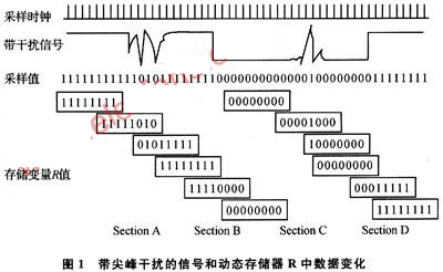 從單片機計數(shù)輸入端,觀察信號波形。為便于分析,在高、低電平段設(shè)置了幾個干擾尖峰脈沖,分別標(biāo)示為Section A和Section C,占空比信號下降沿、上升沿分別標(biāo)示為Section B和Section D。單片機按計數(shù)時鐘周期性采樣,采樣值中“1”表示采到的是高電平,“0”表示低電平。I/O口采樣占空比信號輸出端口中狀態(tài),利用1個字節(jié)型變量R來動態(tài)存儲采樣值。控制器每采樣1次,變量R中數(shù)據(jù)向左移1個二進(jìn)制位,R原最高位電平狀態(tài)被移除,而當(dāng)前時刻新的采樣狀態(tài)保存到R的最低位,變量R被更新了,狀態(tài)存儲器R中保存著最近8個采樣周期的采樣值。