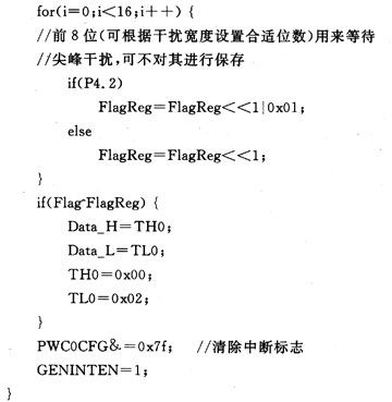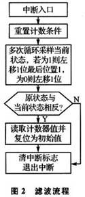 根據(jù)軟件濾波設(shè)計思想,濾波子程序由主程序在信號狀態(tài)發(fā)生變化,進(jìn)入中斷時調(diào)用,圖2給出了濾波程序流程。對照圖1中4種Section來分析流程圖。當(dāng)有邊沿或干擾信號(信號周期大于計數(shù)時鐘周期)到來時,VRS51L3074單片機的PWC計數(shù)停止條件滿足,系統(tǒng)進(jìn)入中斷服務(wù)子程序。在中斷子程序中,首先重置脈寬計數(shù)條件,然后對當(dāng)前狀態(tài)進(jìn)行采樣,采樣1次,狀態(tài)寄存器左移1位,采樣到高電平記為“1”,采樣到低電平記為“0”。如正常下降沿Section B,前面處于高電平段,初始狀態(tài)變量Flag全為1,當(dāng)出現(xiàn)低電平,控制器進(jìn)人中斷,緊接著進(jìn)行16次采樣。前已提及系統(tǒng)處理的尖峰干擾約1~2 ms,每個采樣周期約為0.4 ms,其尖峰干擾脈寬達(dá)不到8個采樣周期。系統(tǒng)設(shè)計時采樣16次,只取最后8次的存儲狀態(tài)與原狀態(tài)進(jìn)行比較,如果最后采樣的狀態(tài)全為“0”則與原狀態(tài)相反,就可判斷出這是1個正常下降沿。如果是干擾信號引起計數(shù)中斷,前面8個采樣狀態(tài)不全為“1”,后面8個狀態(tài)全為“1”,最后采樣的狀態(tài)與原狀態(tài)相同,就可判斷出這是1個干擾信號,如Section A。在信號狀態(tài)采樣期間,計數(shù)條件滿足PWC繼續(xù)計數(shù),直到真正的下降沿到來,計數(shù)停止并保存,計數(shù)寄存器還原為初始值,這樣干擾信號即被濾除。類似地,正常上升沿Section D,存儲器原狀態(tài)為“0”,上升沿來臨后存儲器狀態(tài)為“1”,與原狀態(tài)相反,PWC計數(shù)停止并保存,計數(shù)寄存器還原為初始值,退出中斷子程序。有干擾信號出現(xiàn)后采樣狀態(tài)與原狀態(tài)相同,干擾尖峰脈沖可被濾除。如果要使脈寬計數(shù)更精確,可判斷前8個采樣周期中系統(tǒng)不正常計數(shù)的周期,然后與最終計數(shù)周期相加即可。此時,程序流程體現(xiàn)出軟件濾波功能。