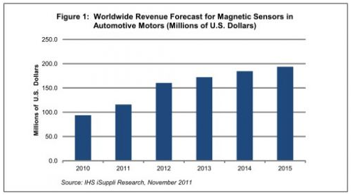 據(jù)IHS iSuppli公司的磁傳感器專(zhuān)題報(bào)告,由于能夠改善汽車(chē)安全性、便利性和燃油效率,硅磁傳感器在汽車(chē)電機(jī)中的應(yīng)用將快速增長(zhǎng),該市場(chǎng)的銷(xiāo)售額將在2012年增長(zhǎng)近40%。
