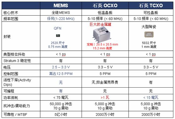 圖4:MEMS三級鐘和傳統OCXO和TCXO三級鐘的比較